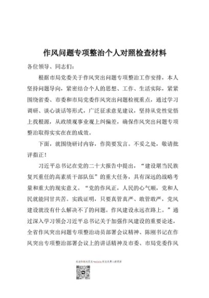 / 【七哥公文】2024年:作风问题专项整治个人对照检查材料+更多免费公文+VX:QiGeGongWen2024