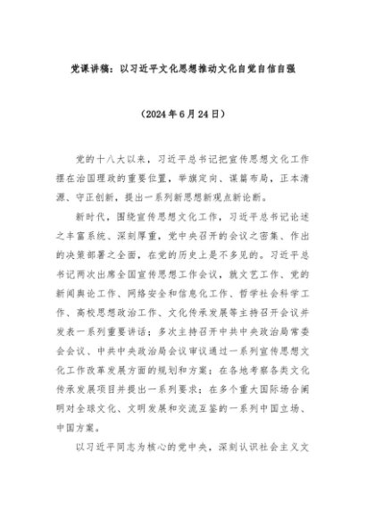 / 【七哥公文】2024年:党课讲稿:以习总书记文化思想推动文化自觉自信自强+更多免费公文+VX:QiGeGongWen2024