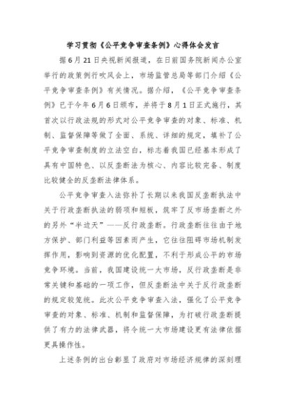 / 【七哥公文】2024年:学习贯彻《公平竞争审查条例》心得体会发言+更多免费公文+VX:QiGeGongWen2024