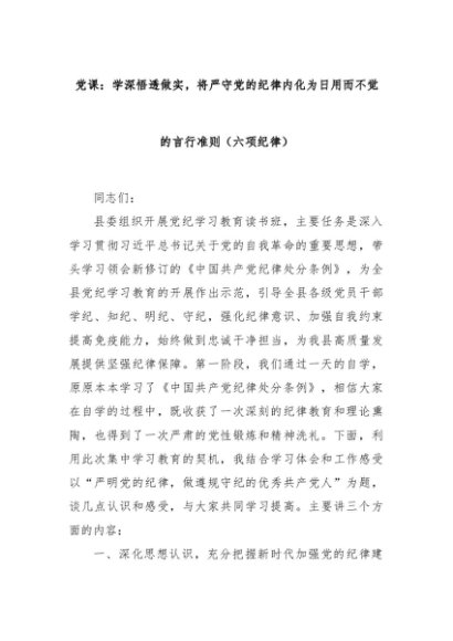 【七哥公文】2024年:党课:学深悟透做实,将严守党的纪律内化为日用而不觉的言行准则(六项纪律)+更多免费公文+VX:QiGeGongWen2024