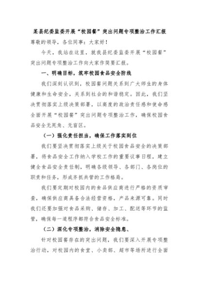 【七哥公文】2024年:某县纪委监委开展“校园餐”突出问题专项整治工作汇报+更多免费公文+VX:QiGeGongWen2024