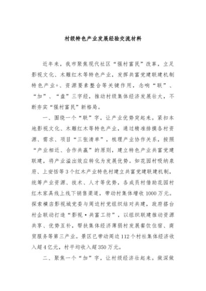 / 【七哥公文】2024年:村级特色产业发展经验交流材料+更多免费公文+VX:QiGeGongWen2024