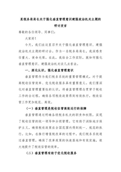 【七哥公文】2024年:某税务局局长关于强化垂直管理意识建强政治机关主题的研讨发言+更多免费公文+VX:QiGeGongWen2024