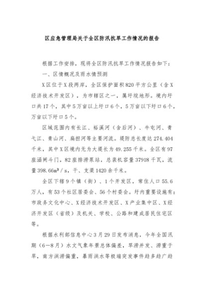 / 【七哥公文】2024年:区应急管理局关于全区防汛抗旱工作情况的报告+更多免费公文+VX:QiGeGongWen2024