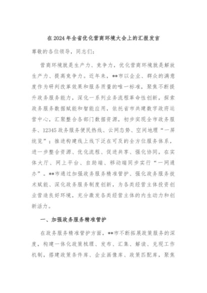 / 【七哥公文】2024年:在2024年全省优化营商环境大会上的汇报发言+更多免费公文+VX:QiGeGongWen2024