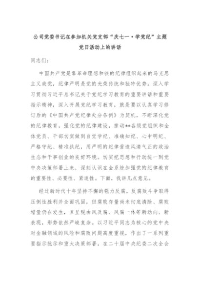 【七哥公文】2024年:公司党委书记在参加机关党支部“庆七一·学党纪”主题党日活动上的讲话+更多免费公文+VX:QiGeGongWen2024