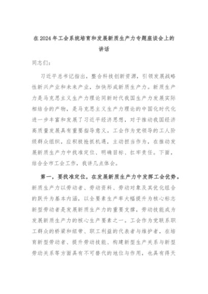 【七哥公文】2024年:在2024年工会系统培育和发展新质生产力专题座谈会上的讲话+更多免费公文+VX:QiGeGongWen2024