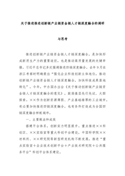 【七哥公文】2024年:关于推进推进创新链产业链资金链人才链深度融合的调研与思考+更多免费公文+VX:QiGeGongWen2024