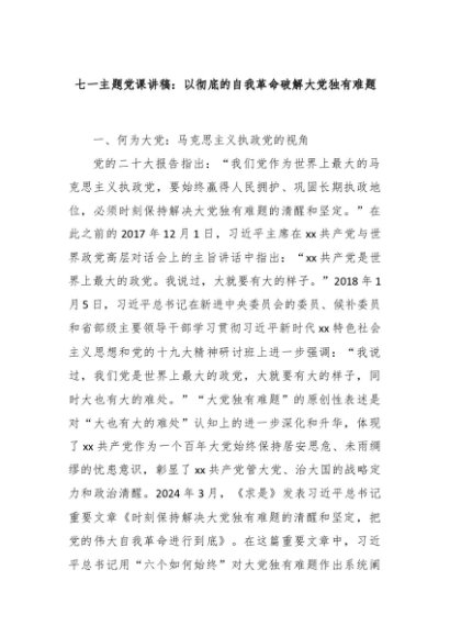 【七哥公文】2024年:七一主题党课讲稿:以彻底的自我革命破解大党独有难题+更多免费公文+VX:QiGeGongWen2024