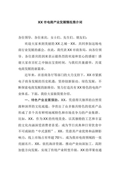 【七哥公文】2024年:XX市电商产业发展情况推介词+更多免费公文+VX:QiGeGongWen2024