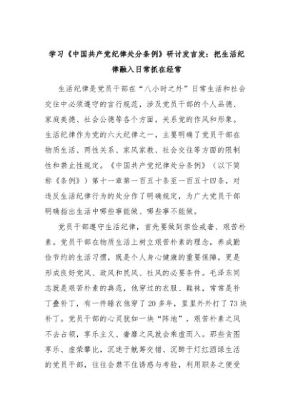 【七哥公文】2024年:学习《中国共产党纪律处分条例》研讨发言发:把生活纪律融入日常抓在经常+更多免费公文+VX:QiGeGongWen2024