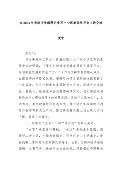 【七哥公文】2024年:在2024年市政府党组理论学习中心组集体学习会上的交流发言+更多免费公文+VX:QiGeGongWen2024