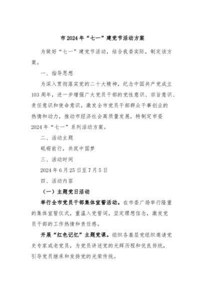 / 【七哥公文】2024年:市2024年“七一”建党节活动方案+更多免费公文+VX:QiGeGongWen2024
