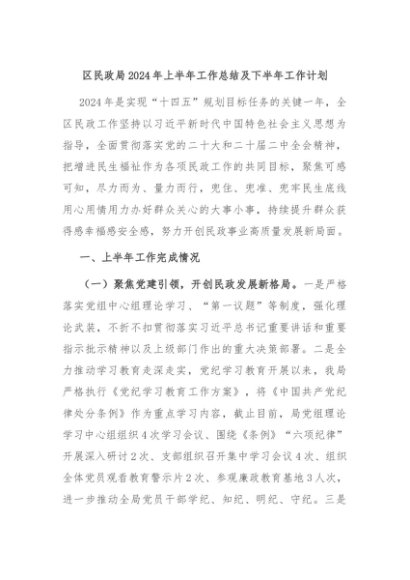 / 【七哥公文】2024年:区民政局2024年上半年工作总结及下半年工作计划+更多免费公文+VX:QiGeGongWen2024