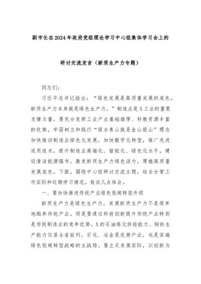 【七哥公文】2024年:副市长在2024年政府党组理论学习中心组集体学习会上的研讨交流发言(新质生产力专题)+更多免费公文+VX:QiGeGongWen2024