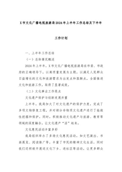 【七哥公文】2024年:X市文化广播电视旅游局2024年上半年工作总结及下半年工作计划+更多免费公文+VX:QiGeGongWen2024