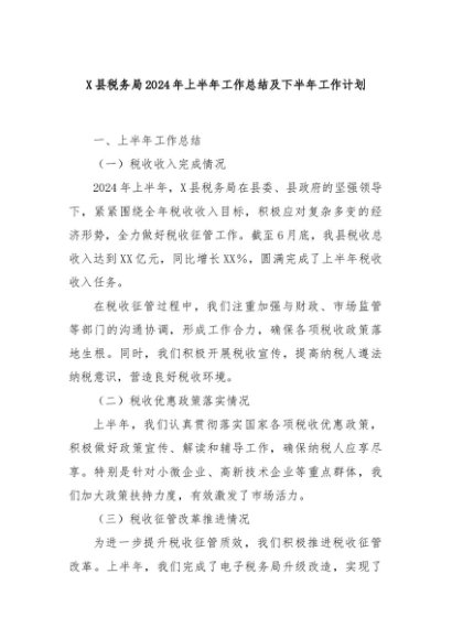 【七哥公文】2024年:X县税务局2024年上半年工作总结及下半年工作计划+更多免费公文+VX:QiGeGongWen2024