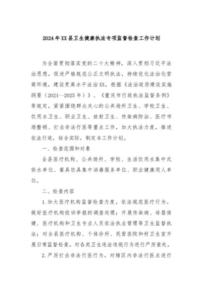 / 【七哥公文】2024年:2024年XX县卫生健康执法专项监督检查工作计划+更多免费公文+VX:QiGeGongWen2024