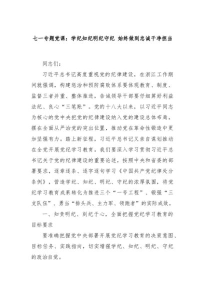 【七哥公文】2024年:七一专题党课:学纪知纪明纪守纪 始终做到忠诚干净担当+更多免费公文+VX:QiGeGongWen2024
