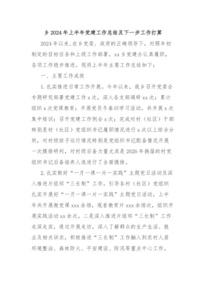 / 【七哥公文】2024年:乡2024年上半年党建工作总结及下一步工作打算+更多免费公文+VX:QiGeGongWen2024