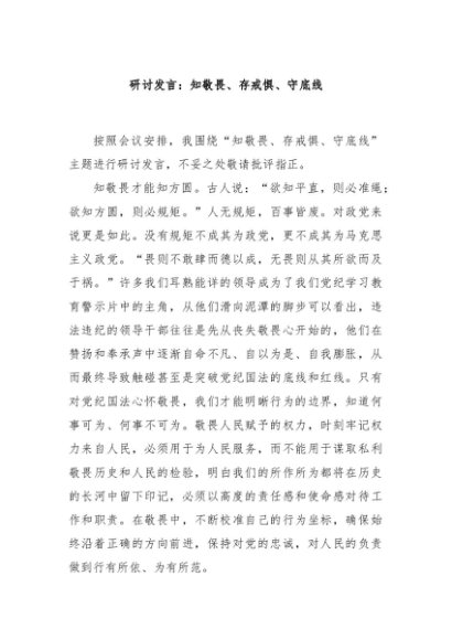/ 【七哥公文】2024年:研讨发言:知敬畏、存戒惧、守底线+更多免费公文+VX:QiGeGongWen2024