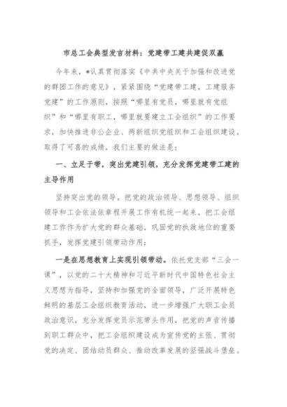 / 【七哥公文】2024年:市总工会典型发言材料:党建带工建共建促双赢+更多免费公文+VX:QiGeGongWen2024
