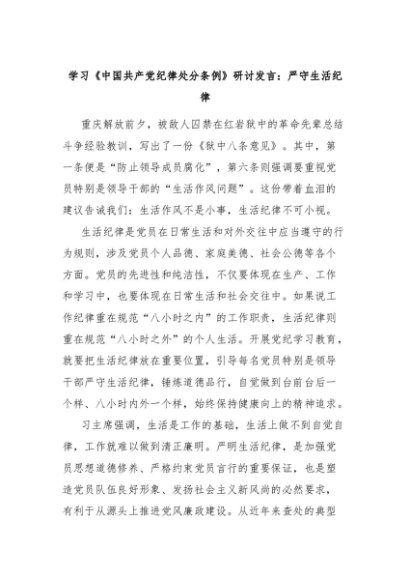 【七哥公文】2024年:学习《中国共产党纪律处分条例》研讨发言:严守生活纪律+更多免费公文+VX:QiGeGongWen2024