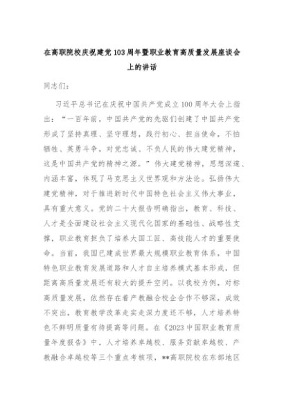【七哥公文】2024年:在高职院校庆祝建党103周年暨职业教育高质量发展座谈会上的讲话+更多免费公文+VX:QiGeGongWen2024
