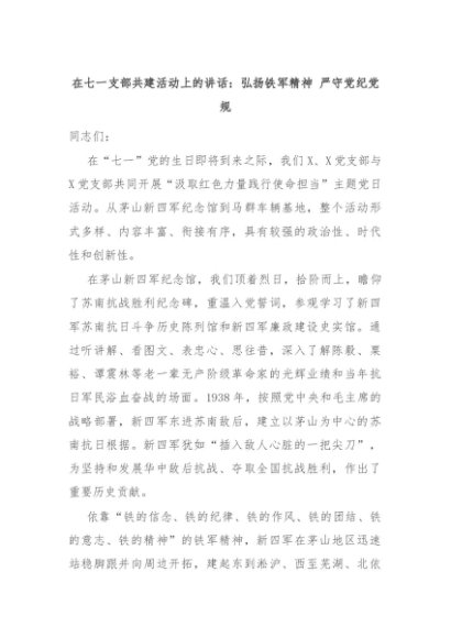 【七哥公文】2024年:在七一支部共建活动上的讲话:弘扬铁军精神 严守党纪党规+更多免费公文+VX:QiGeGongWen2024