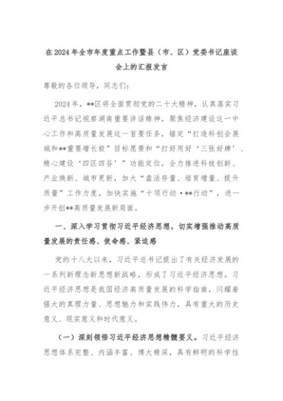 【七哥公文】2024年:在2024年全市年度重点工作暨县(市、区)党委书记座谈会上的汇报发言+更多免费公文+VX:QiGeGongWen2024