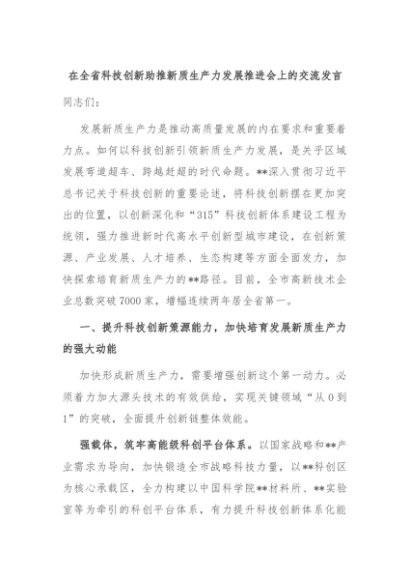 【七哥公文】2024年:在全省科技创新助推新质生产力发展推进会上的交流发言+更多免费公文+VX:QiGeGongWen2024