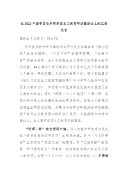 【七哥公文】2024年:在2024年国资国企系统爱国主义教育现场推进会上的汇报发言+更多免费公文+VX:QiGeGongWen2024