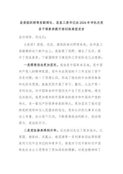 【七哥公文】2024年:县委组织部常务副部长、县直工委书记在2024年市机关党务干部素养提升培训班典型发言+更多免费公文+VX:QiGeGongWen2024