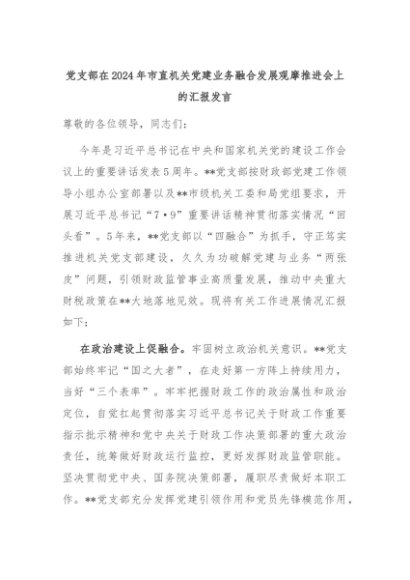 【七哥公文】2024年:党支部在2024年市直机关党建业务融合发展观摩推进会上的汇报发言+更多免费公文+VX:QiGeGongWen2024