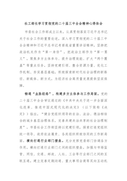 / 【七哥公文】2024年:社工部长学习贯彻党的二十届三中全会精神心得体会+更多免费公文+VX:QiGeGongWen2024