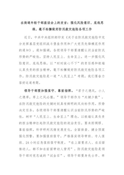 【七哥公文】2024年:在街道年轻干部座谈会上的发言:强化风险意识、底线思维,毫不松懈做好防汛救灾抢险各项工作+更多免费公文+VX:QiGeGongWen2024