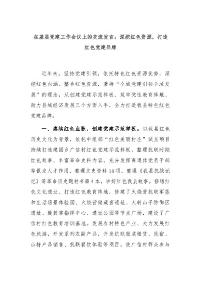 【七哥公文】2024年:在基层党建工作会议上的交流发言:深挖红色资源,打造红色党建品牌+更多免费公文+VX:QiGeGongWen2024