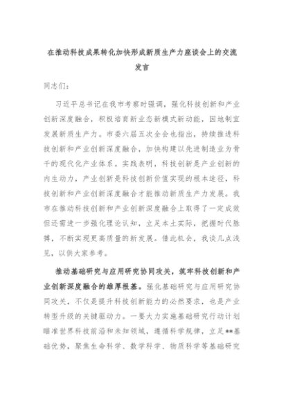 【七哥公文】2024年:在推动科技成果转化加快形成新质生产力座谈会上的交流发言+更多免费公文+VX:QiGeGongWen2024