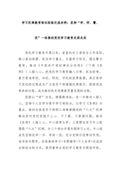 【七哥公文】2024年:学习纪律教育培训经验交流材料:坚持“学、研、警、促”一体推动党纪学习教育走深走实+更多免费公文+VX:QiGeGongWen2024