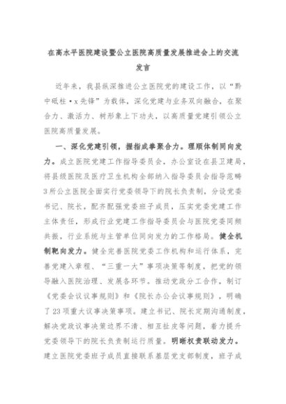 【七哥公文】2024年:在高水平医院建设暨公立医院高质量发展推进会上的交流发言+更多免费公文+VX:QiGeGongWen2024