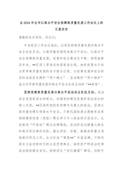 【七哥公文】2024年:在2024年全市以高水平安全保障高质量发展工作会议上的汇报发言+更多免费公文+VX:QiGeGongWen2024
