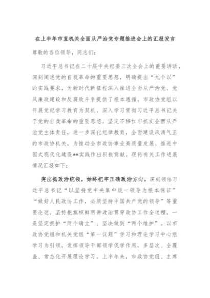 【七哥公文】2024年:在上半年市直机关全面从严治党专题推进会上的汇报发言+更多免费公文+VX:QiGeGongWen2024