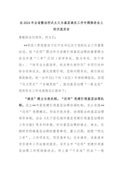 【七哥公文】2024年:在2024年全省整治形式主义为基层减负工作专题推进会上的交流发言+更多免费公文+VX:QiGeGongWen2024