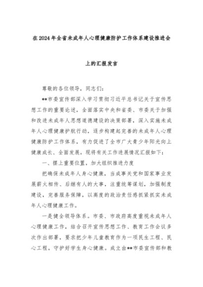 【七哥公文】2024年:在2024年全省未成年人心理健康防护工作体系建设推进会上的汇报发言+更多免费公文+VX:QiGeGongWen2024