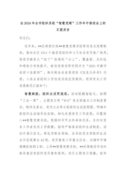 【七哥公文】2024年:在2024年全市组织系统“智慧党建”工作年中推进会上的汇报发言+更多免费公文+VX:QiGeGongWen2024