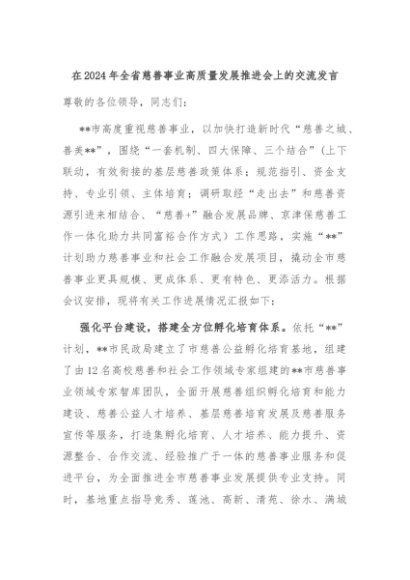 【七哥公文】2024年:在2024年全省慈善事业高质量发展推进会上的交流发言+更多免费公文+VX:QiGeGongWen2024