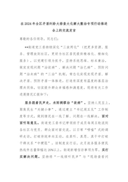 【七哥公文】2024年:在2024年全区矛盾纠纷大排查大化解大整治专项行动推进会上的交流发言+更多免费公文+VX:QiGeGongWen2024