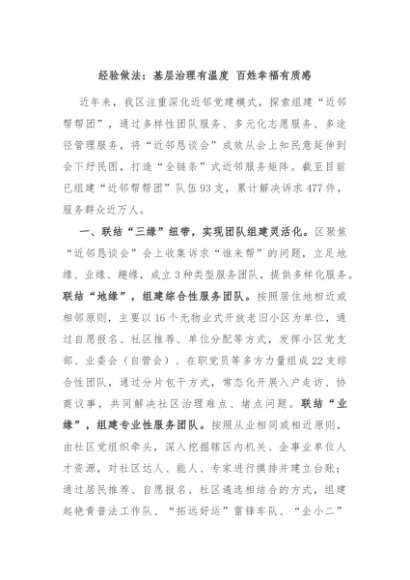 / 【七哥公文】2024年:经验做法:基层治理有温度 百姓幸福有质感+更多免费公文+VX:QiGeGongWen2024