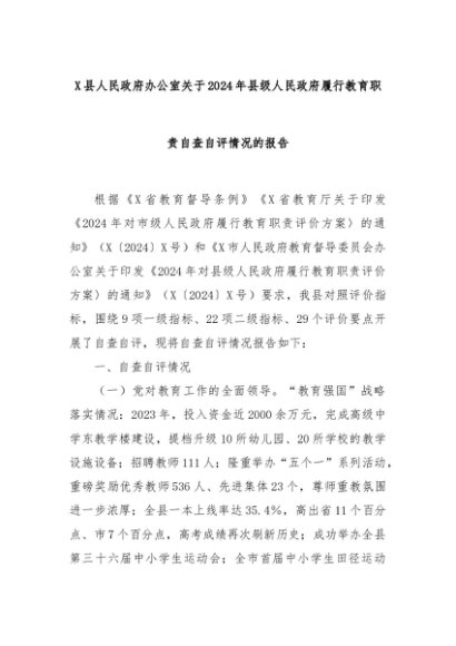 【七哥公文】2024年:X县人民政府办公室关于2024年县级人民政府履行教育职责自查自评情况的报告+更多免费公文+VX:QiGeGongWen2024