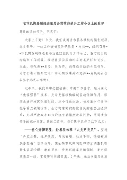 / 【七哥公文】2024年:在市机构编制推进基层治理效能提升工作会议上的致辞+更多免费公文+VX:QiGeGongWen2024